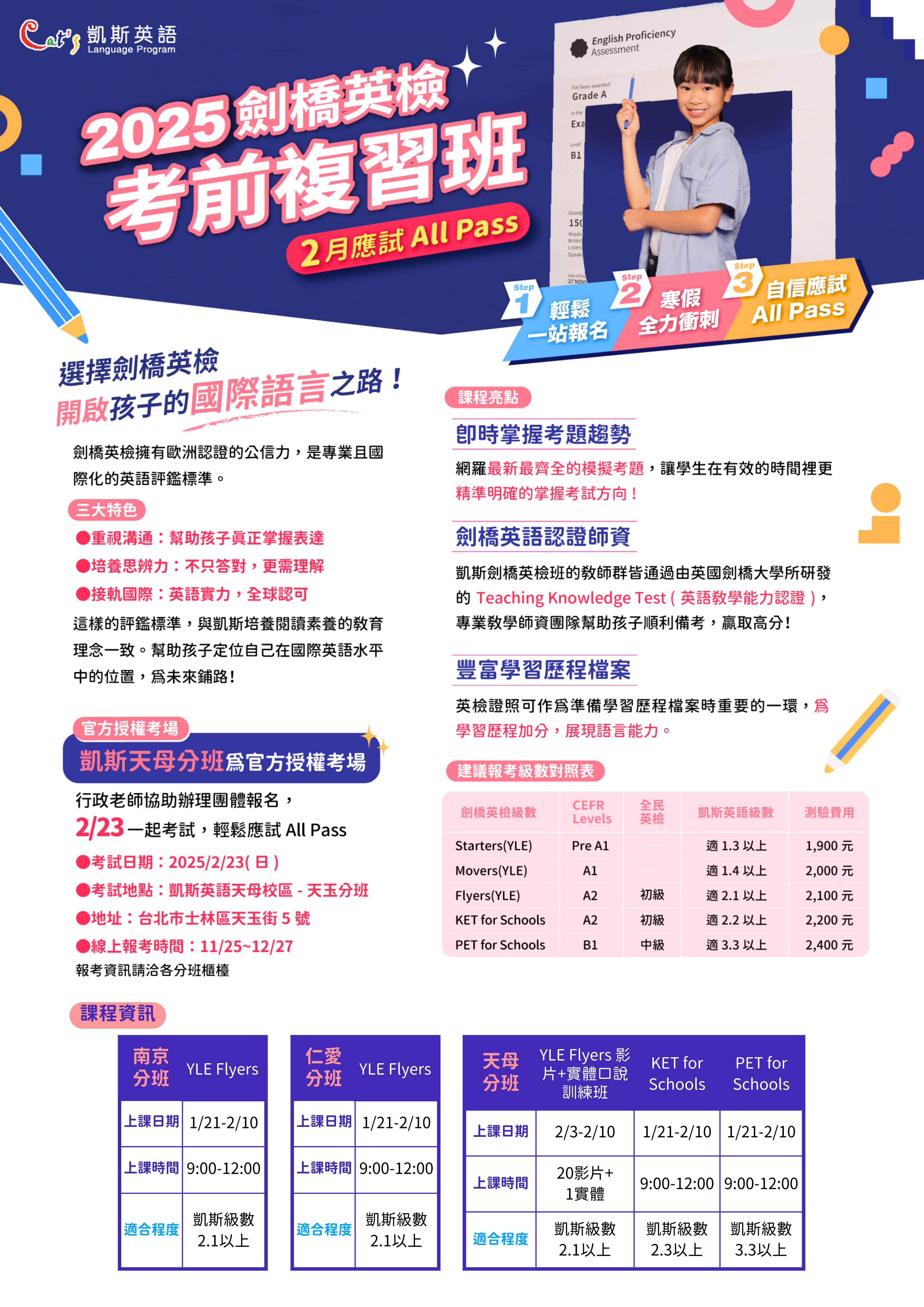 寒假是強化語言力的關鍵時機,凱斯英語劍橋英檢考前複習班,精準掌握最新考題趨勢,系統複習重點題型,全面提升應試實力。以國際英語證照打造孩子的學習履歷,為未來競爭力加分,讓語言實力閃耀全場。
