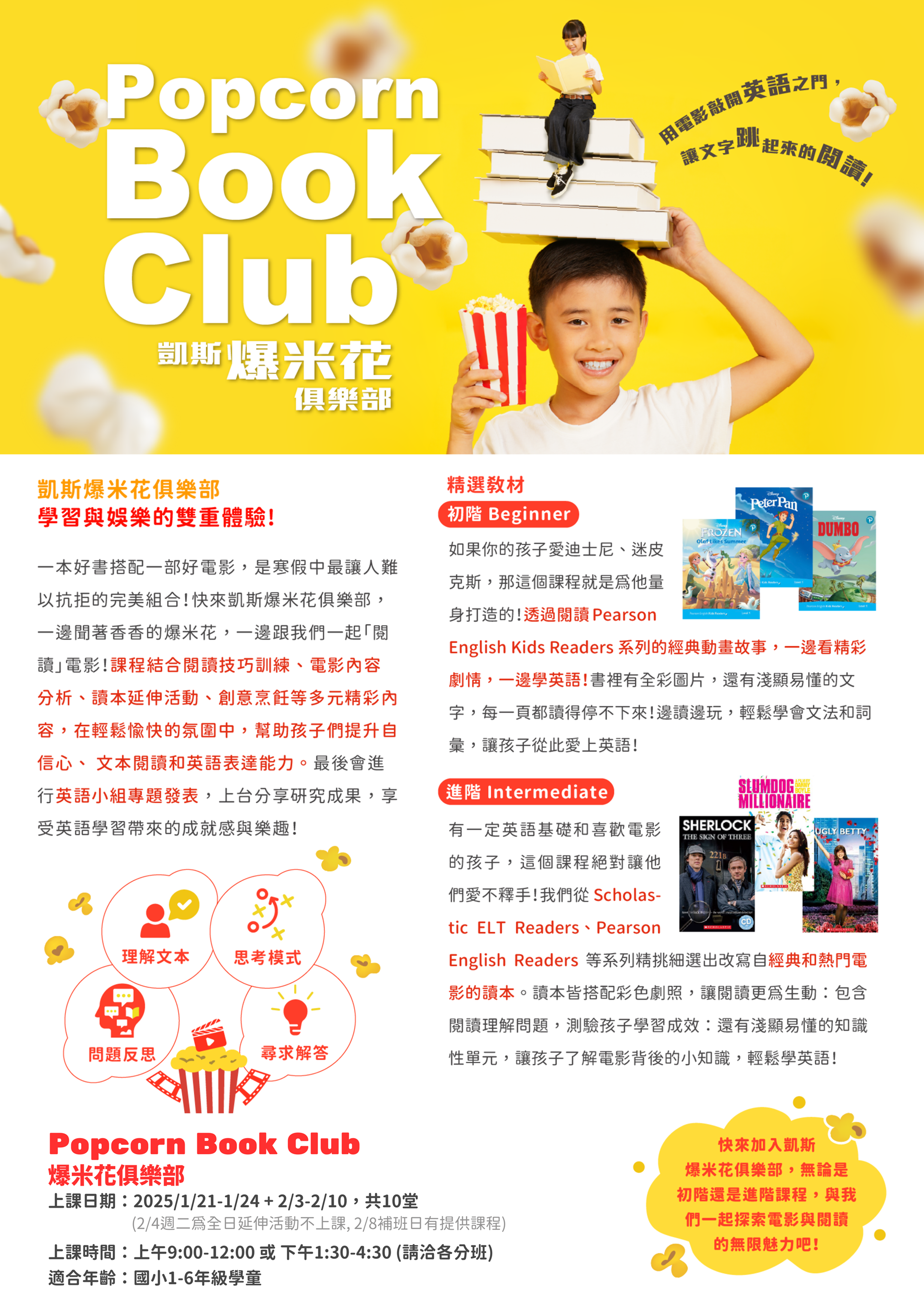 一本好書 × 一部好電影 = 寒假最完美的組合! 凱斯英語邀你加入爆米花俱樂部, 一起 Read Movies, Learn English! 課程結合閱讀訓練、電影內容分析、延伸創作與創意烹飪, 讓孩子在輕鬆愉快的氛圍中提升英語閱讀與表達力!