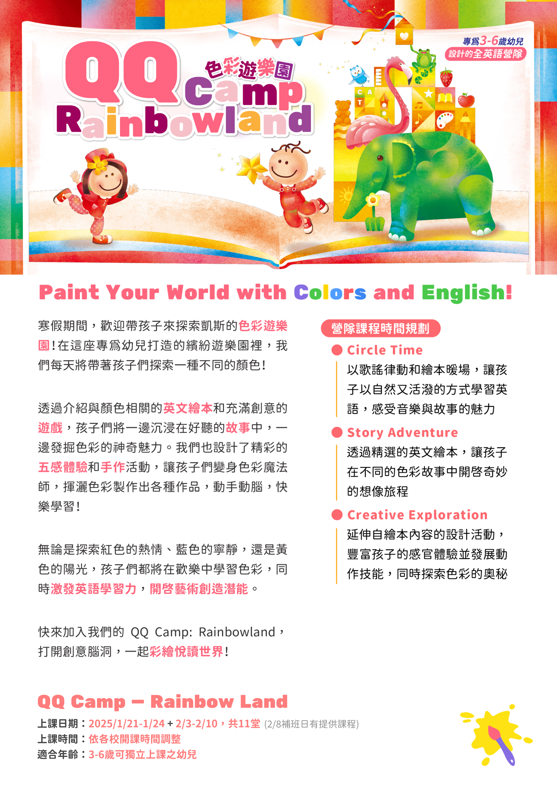 色彩遊樂園開放囉! 踏入這片繽紛的園地,和我們一起探索色彩的無限可能!這裡有歡樂的歌謠、精彩的繪本、趣味十足的活動……現在就帶著滿滿的好奇心,來玩轉這個充滿驚喜的英語彩虹樂園吧!